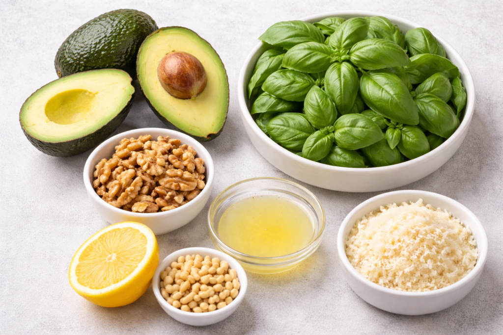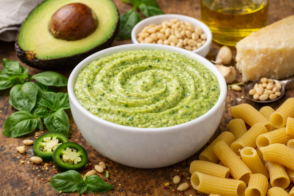 | Pasta | Basil Pesto Avocado | Makes it rich without heavy cream |
