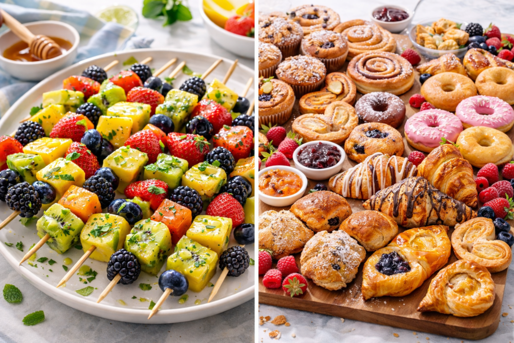 Fruit is always a good idea, but a big fruit salad can get soggy. Personally, I prefer fruit kabobs. They are easy to grab and look very pretty on a platter. A fun fact is that if you drizzle a little lime juice and honey over them, the fruit stays fresh and bright for longer.