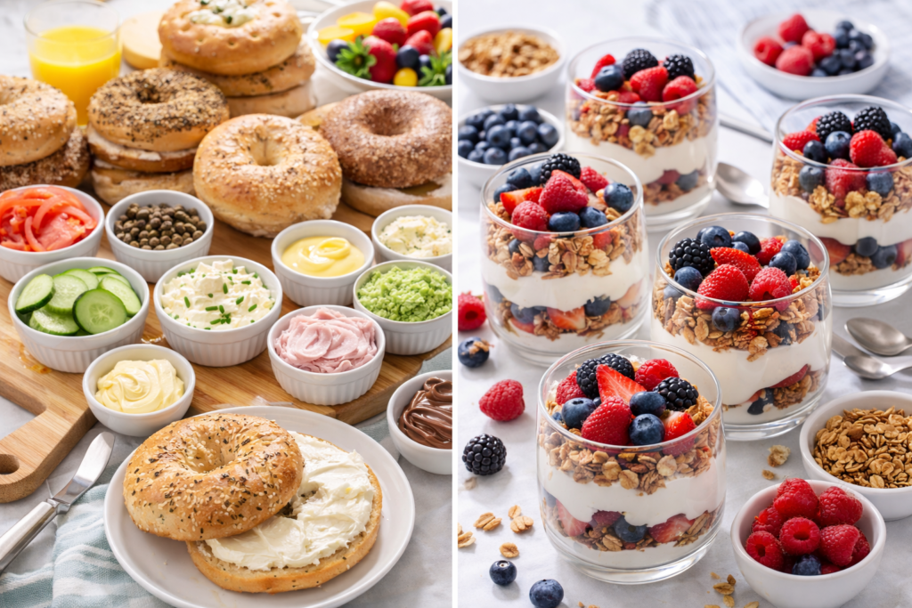 Kids usually love anything they can eat with their hands. Mini pancakes, fruit skewers, and yogurt cups are always hits. If you are worried about picky eaters, plain bagels with cream cheese are a safe bet.