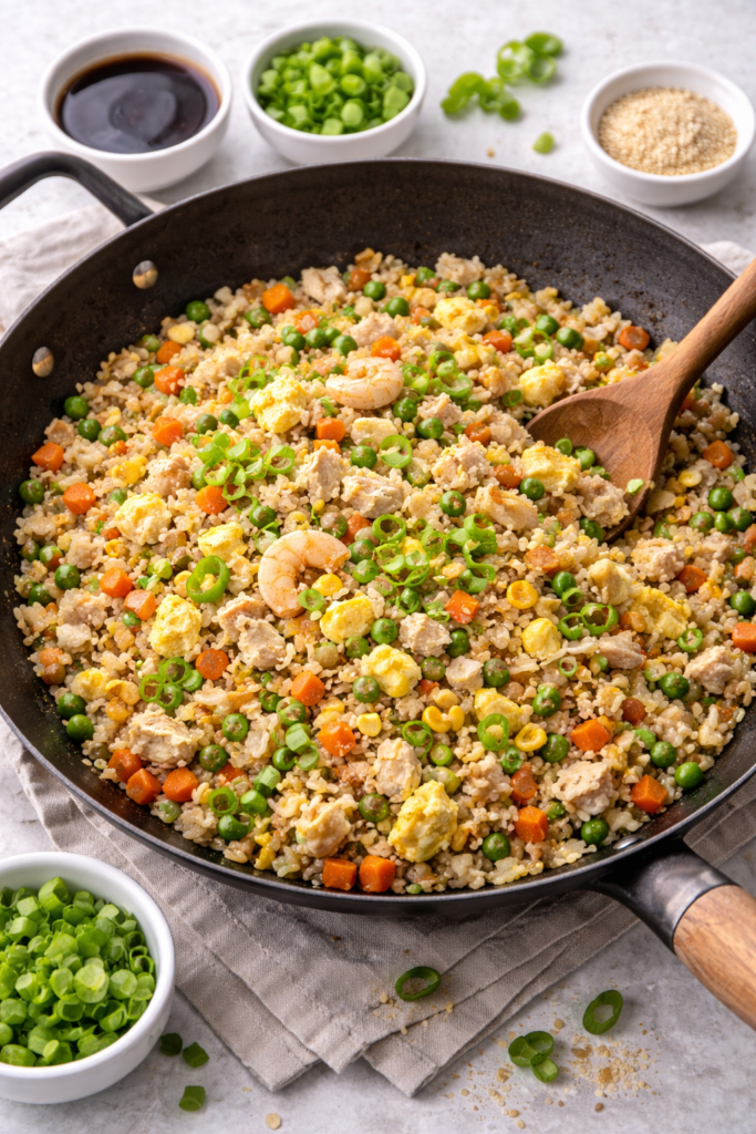 • What you need: Rice, frozen peas and carrots, eggs, and soy sauce.