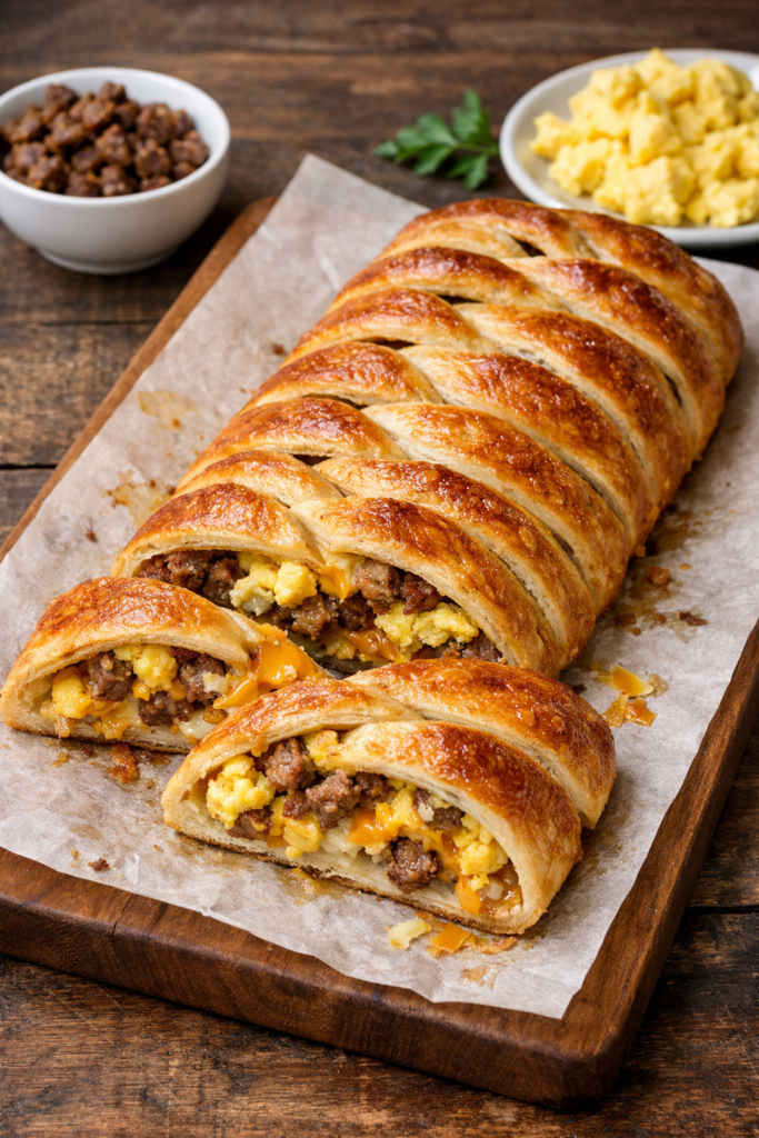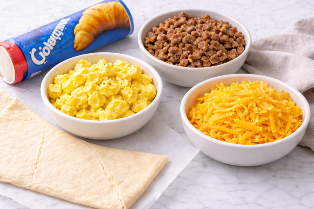 Place eggs, sausage, and cheese down the middle of the dough. This creates a hearty core that stays moist while the outer layers crisp up.
