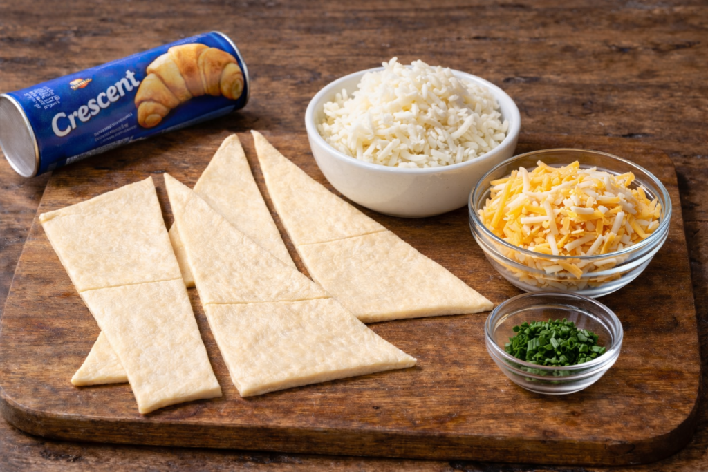 Place the potatoes and cheese onto the crescent triangles. Roll them up loosely so some of the filling is visible at the ends.