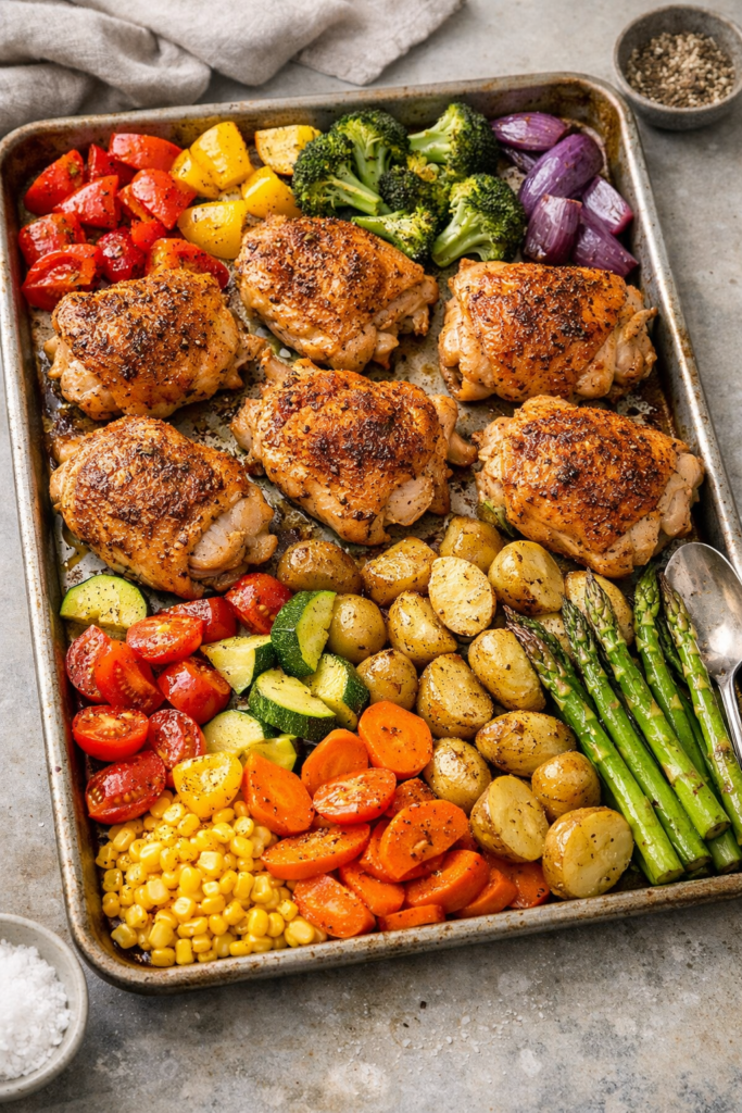 Chop everything up into bite-sized pieces. Toss them in a bowl with a bit of oil and herbs. Spread them out on a large baking sheet. Bake at 200°C for about 25 to 30 minutes. The veggies get nice and roasted, and the chicken stays juicy.