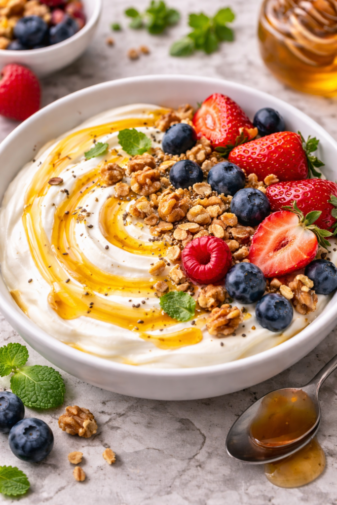 • How to make it: Take a small bowl of plain Greek yogurt, drizzle a tiny bit of honey, and maybe add some berries.