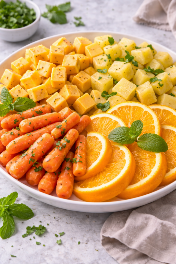 Orange: Carrots and orange slices.