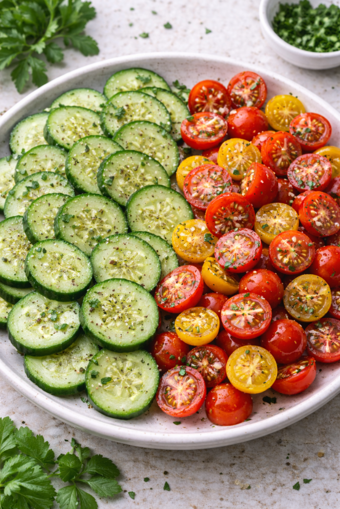 Veg: Sliced cucumbers and cherry tomatoes.
