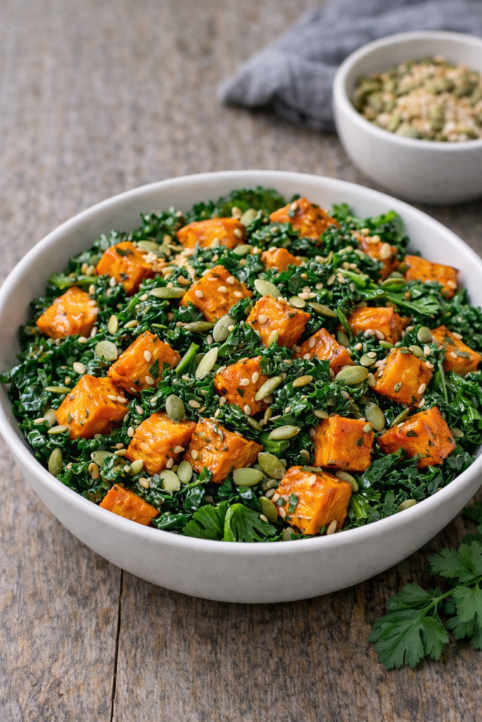 I believe sweet potatoes are the best vegetable. They are sweet and filling at the same time. Roast them in the oven until they are soft. Then mix them with the kale and some seeds.
