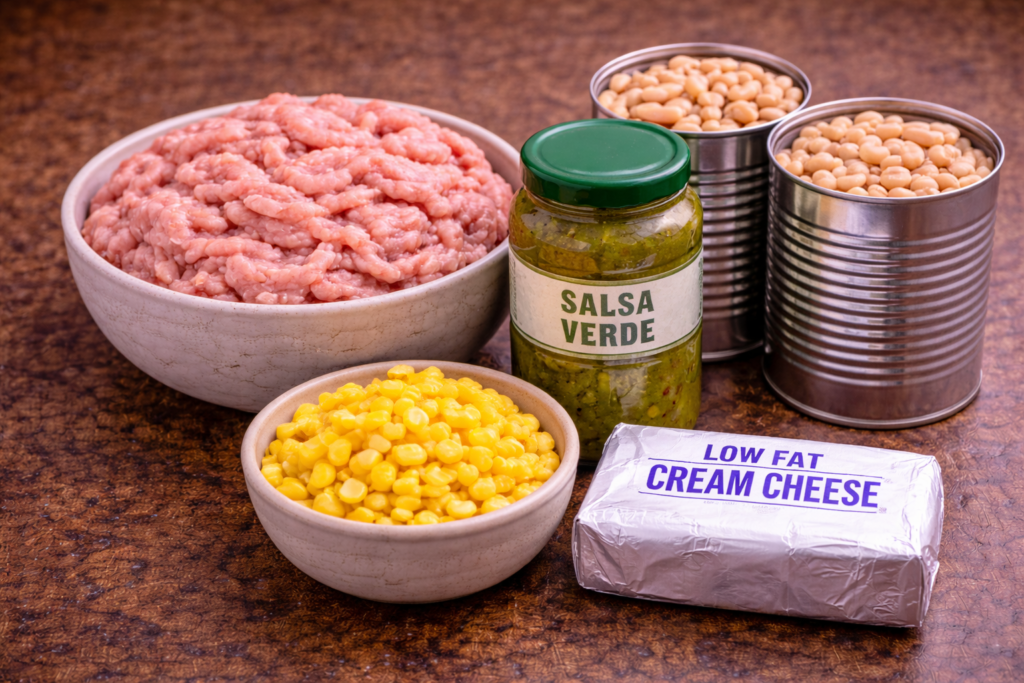 Do you love taco flavors? I know I do. But sometimes a change from red chili is nice. This white chili uses ground turkey and green salsa. It is very high in protein and a bit lighter than traditional beef chili. Plus, it looks great on the table.
