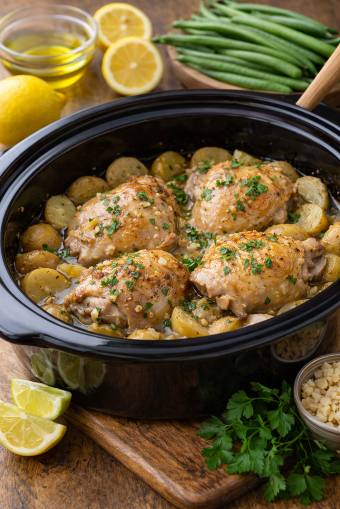In a small bowl, mix the olive oil, lemon juice, and garlic. Pour this mixture all over the chicken and potatoes. Make sure the garlic is spread out well. Set the crockpot to low for six hours.