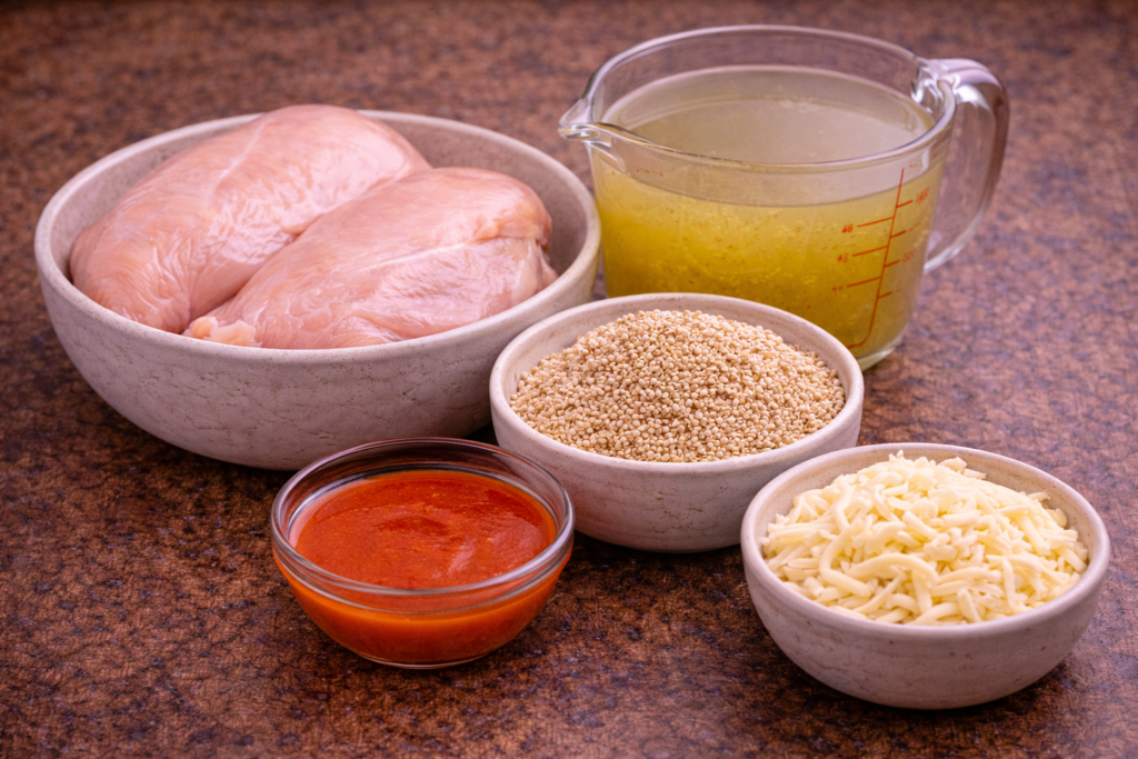 Put the raw chicken and the dry quinoa into the crockpot. Pour in the chicken broth and the buffalo sauce. It might look like a lot of liquid, but the quinoa will soak it all up as it cooks.