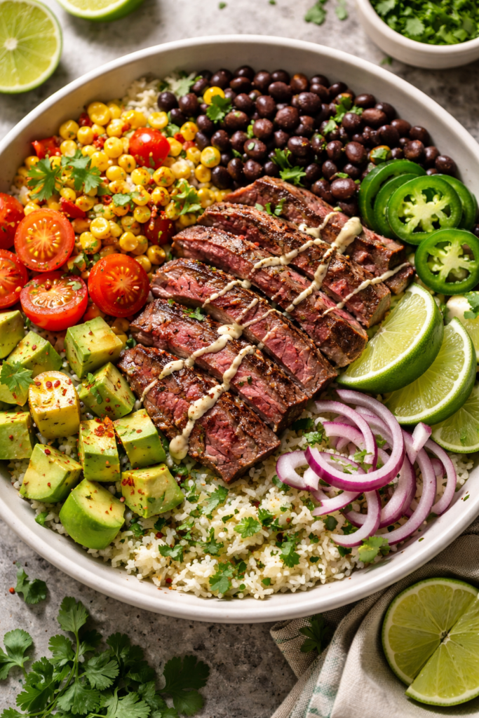 Build your bowl by starting with a base of rice or greens. Add the steak, beans, corn, and peppers. Top it off with a big dollop of Greek yogurt. It tastes exactly like sour cream but has way more protein. You’re about to find out how addictive this one is.