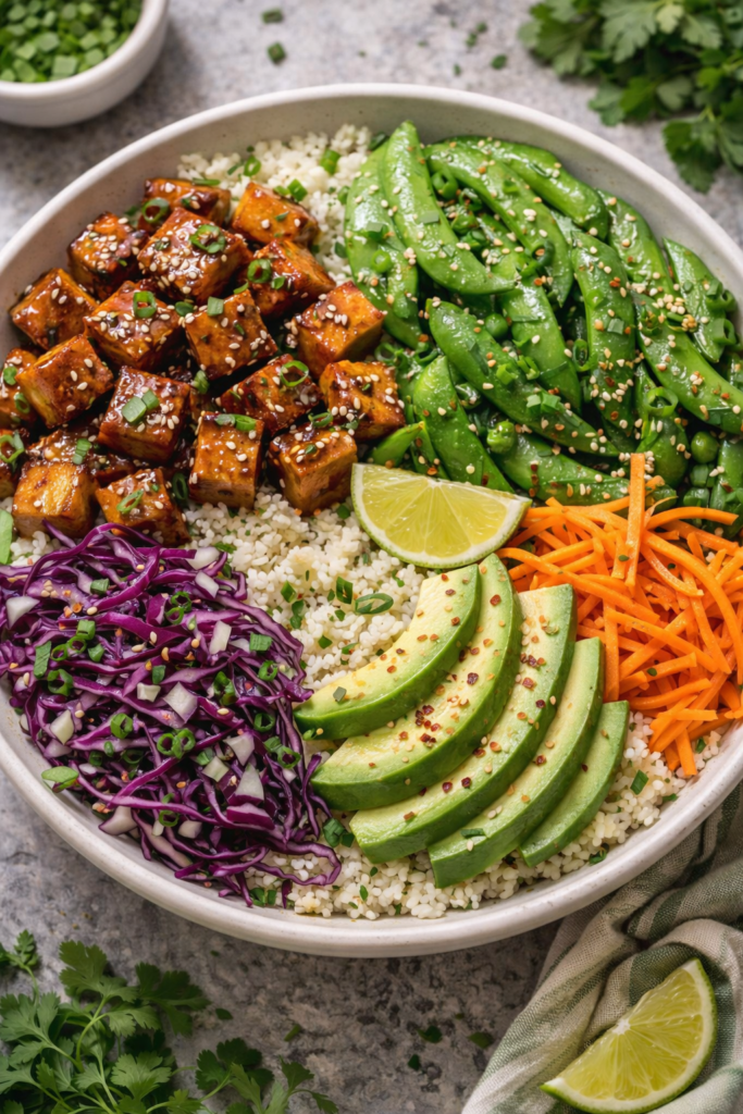 Many people find tofu a bit scary to cook, but it’s actually really fun. It’s like a sponge that soaks up whatever flavors you give it. This is a great high protein dinner bowl for Mondays when you want something light.