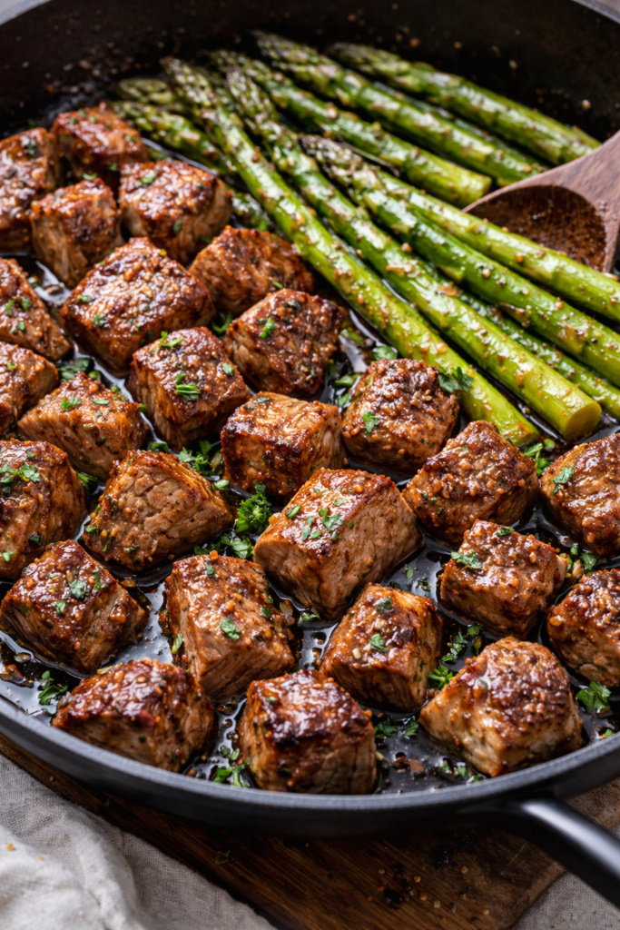• How to do it: Sear the steak in a hot pan with butter and garlic. Throw the asparagus in for the last five minutes.
