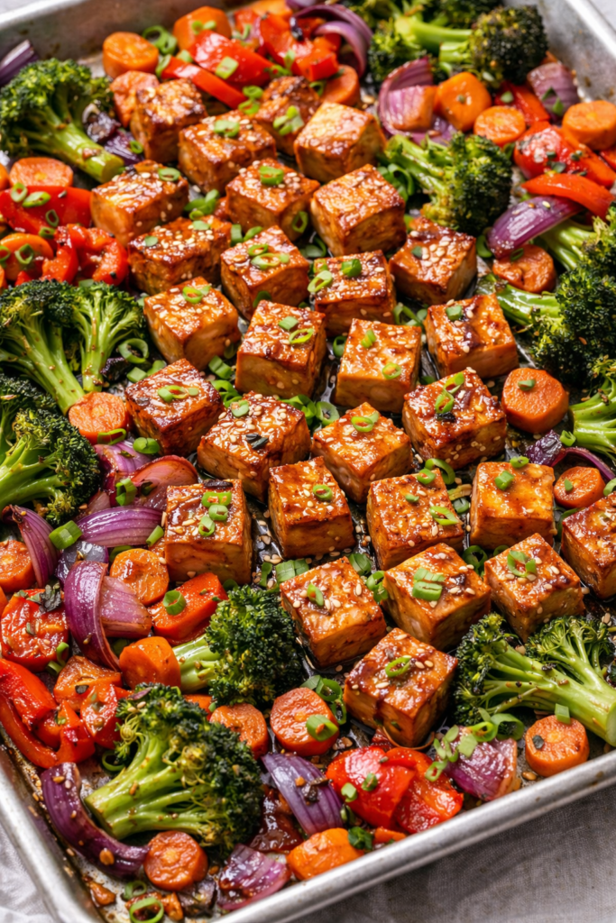 • How to do it: Press the water out of the tofu, cut it into cubes, and bake it on a tray with the peppers.