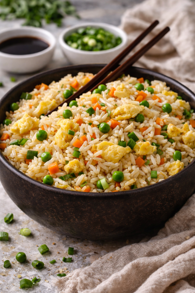 How to make it: Scramble the eggs in a large pan and then set them aside. Throw the veggies into the pan with a little oil until they are warm. Add the rice and the eggs back in. Pour over the soy sauce and stir everything on high heat for a few minutes. It is salty, savory, and incredibly satisfying.