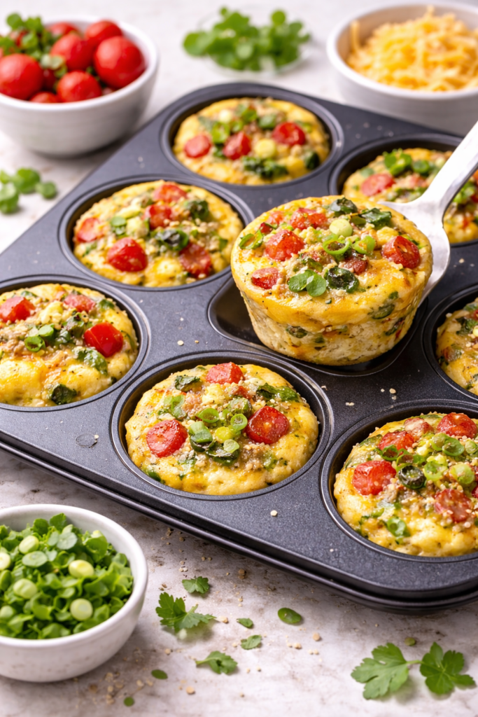 Picture this: a warm, cheesy omelet that fits right in the palm of your hand. That’s exactly what egg muffins are! These are one of the best high protein meal prep breakfasts for weight loss because they keep you full for a long time.