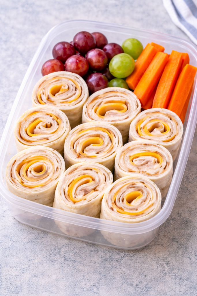 If you do not have a way to heat up your food, this is a great choice. You just take a soft tortilla and spread some cream cheese on it. Then you add slices of turkey and a piece of cheese. Roll it up tight and cut it into small circles.