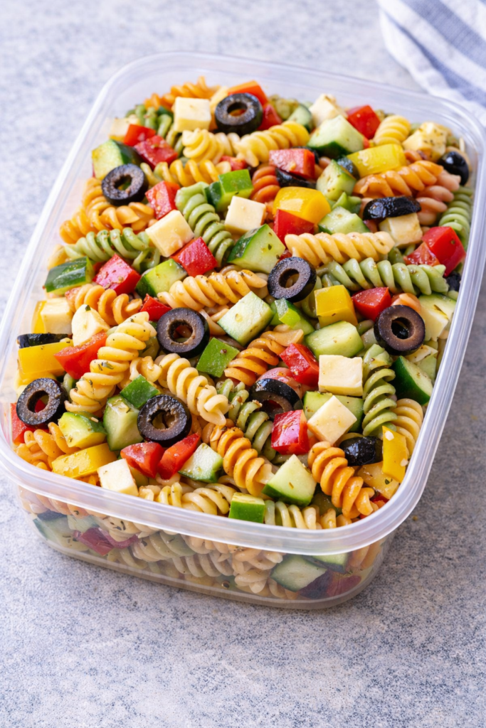 For the sauce, a simple Italian dressing works perfectly. You can also add some cubes of cheese or ham for extra protein. This meal stays fresh in the fridge for about four days. It is colorful and makes you feel good after eating it.
