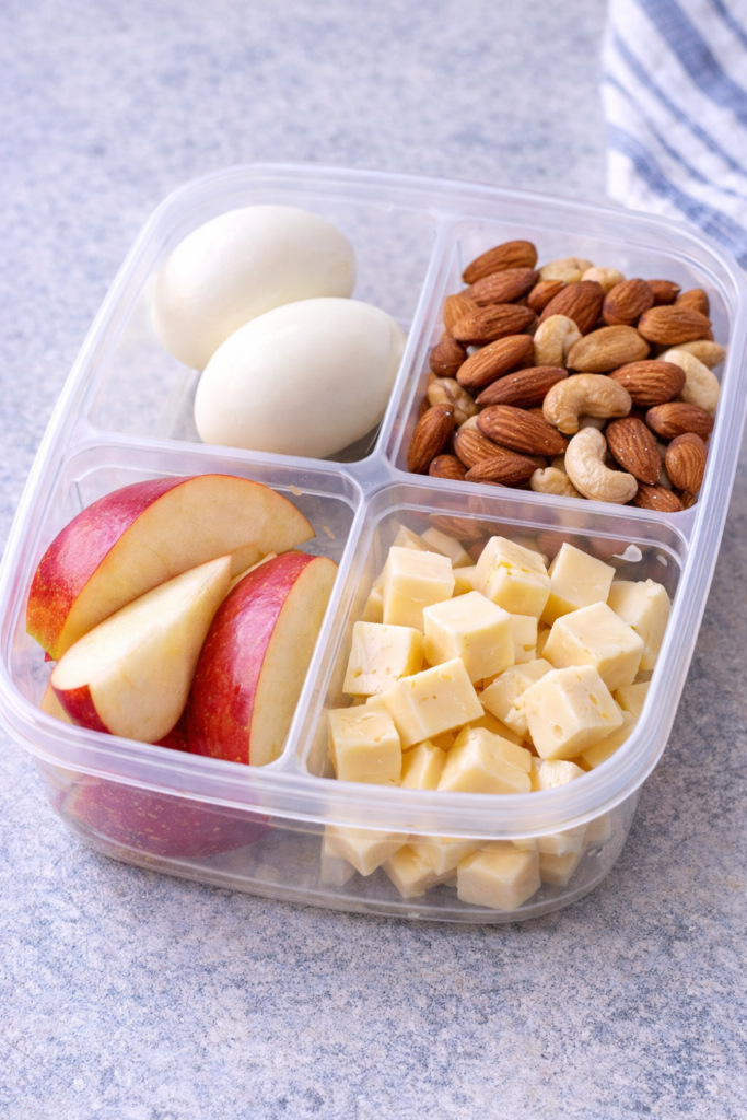 Imagine having a little snack box for lunch. You can put two hard boiled eggs, some cheese cubes, and a handful of nuts. Add some apple slices or berries to make it a complete meal. It is like a homemade version of those expensive snack packs.