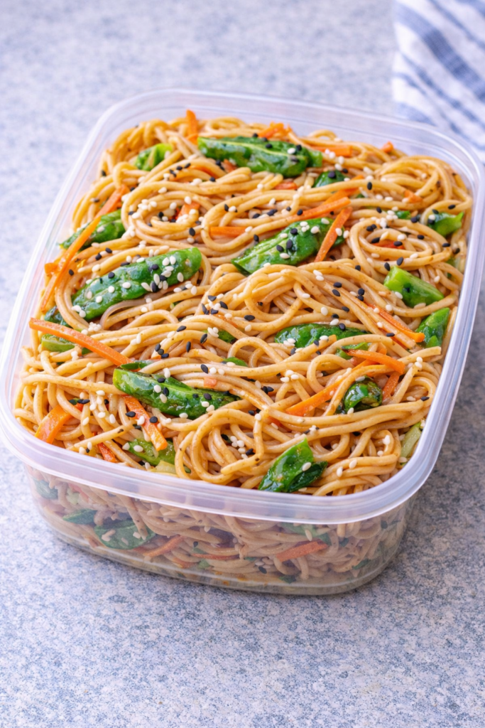 This is a fun way to eat noodles. You can use spaghetti or thin noodles for this. Mix them with a sauce made of peanut butter, soy sauce, and a little bit of honey. Add some shredded carrots and snap peas for a nice crunch.