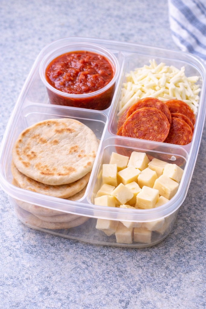 Many kids ask for those store-bought pizza kits, but you can make a better one at home. Use small flatbreads or English muffins as the crust. Pack a small jar of pizza sauce and some shredded mozzarella cheese in separate spots.