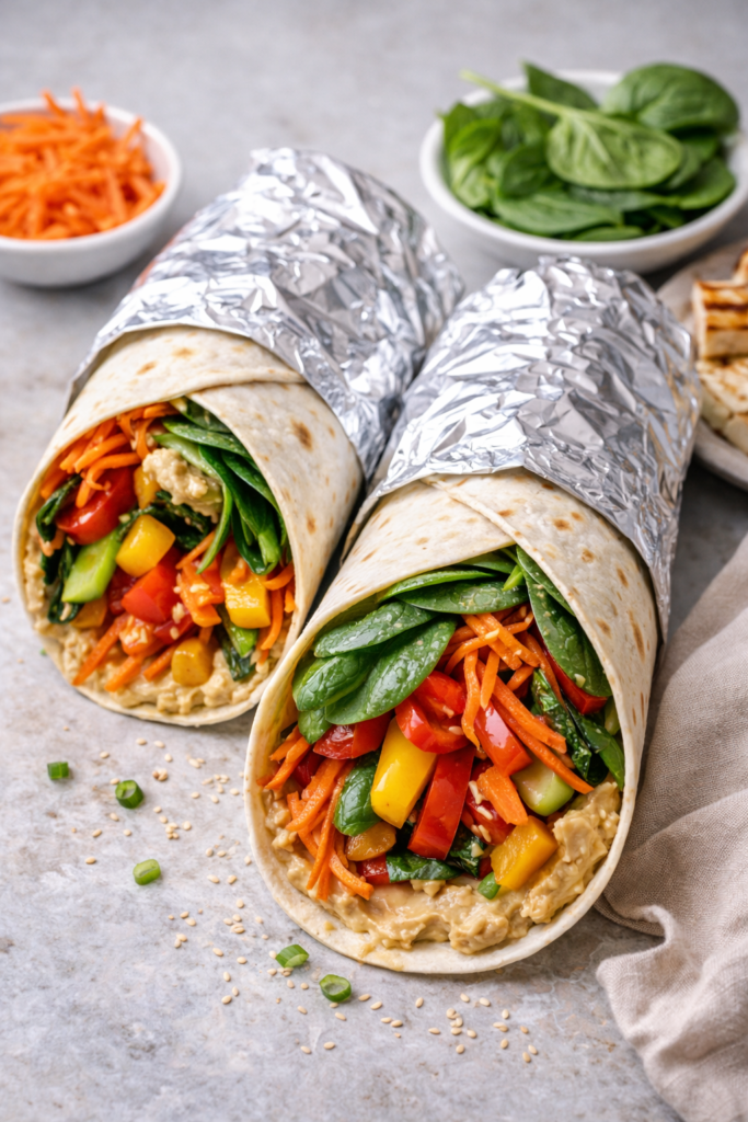 If you want something crunchy and fresh, try a wrap. Spread a thick layer of hummus on a large tortilla. Then pile on some shredded carrots, spinach, and sliced peppers. Roll it up tight and wrap it in foil.
