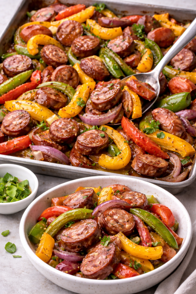 This is another easy one pan meal. Slice up some smoked sausage, onions, and bell peppers. Toss them with a little oil and roast them in the oven. You can eat this on its own or put it inside a hoagie roll.
