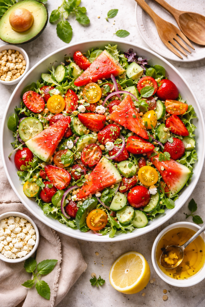 Believe it or not, fruit can be a main course! This is one of those hydrating summer lunch ideas that sounds a bit weird until you try it. The saltiness of the feta cheese against the sweet, dripping watermelon is absolutely incredible.
